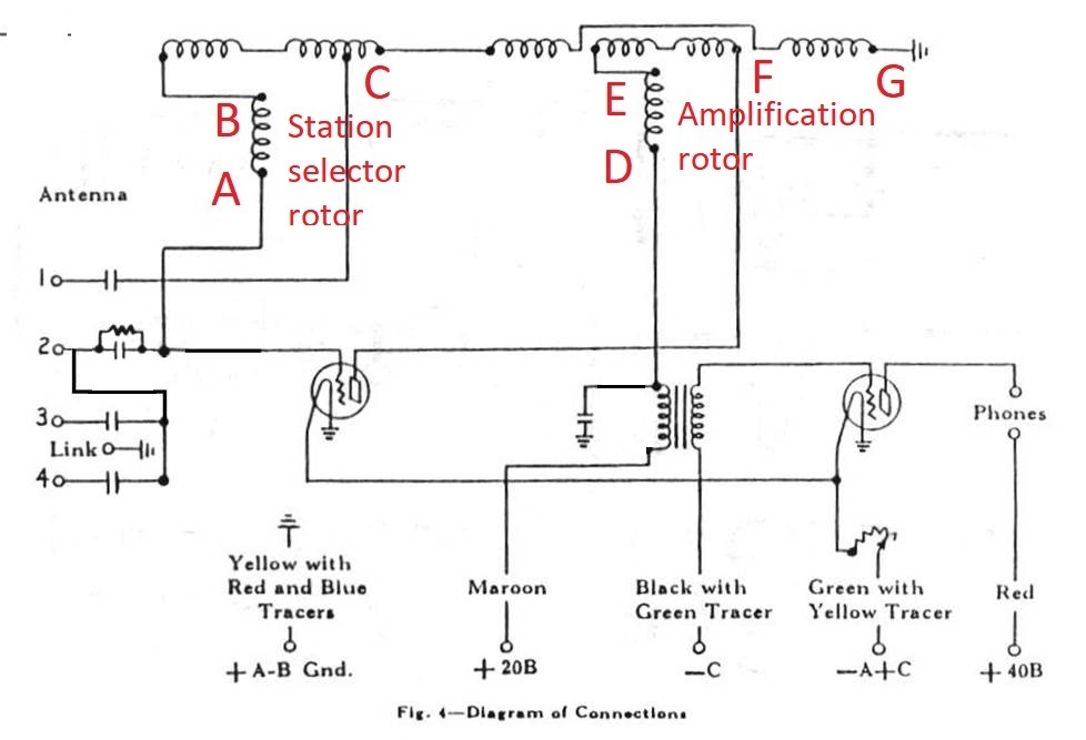 Most schematics on the web show the arrangement in the left picture. A schematic showing the arrangement in the right picture follows. Gen 1 Radiola III Schematic Coil assembly contact points are marked on the next picture and keyed to the points identified on the schematic.